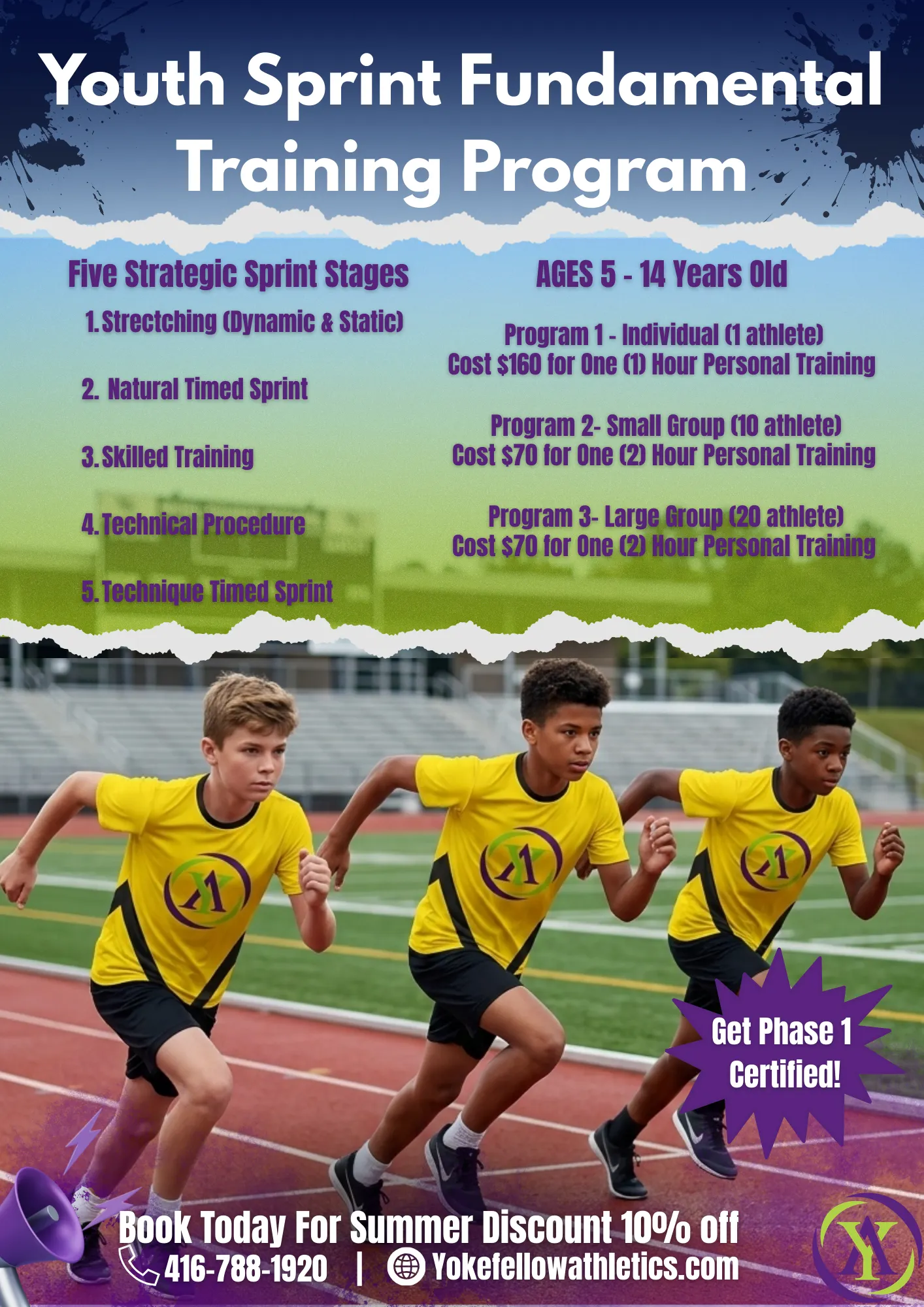 This fall, help your child build speed, confidence, and athletic skills with Yokefellows Athletics’ Olympic-based sprint training in the Mississauga area. Our Phase 1 sessions are designed for school-age athletes ages 5–14, focusing on strong sprinting fundamentals in a fun and supportive environment.